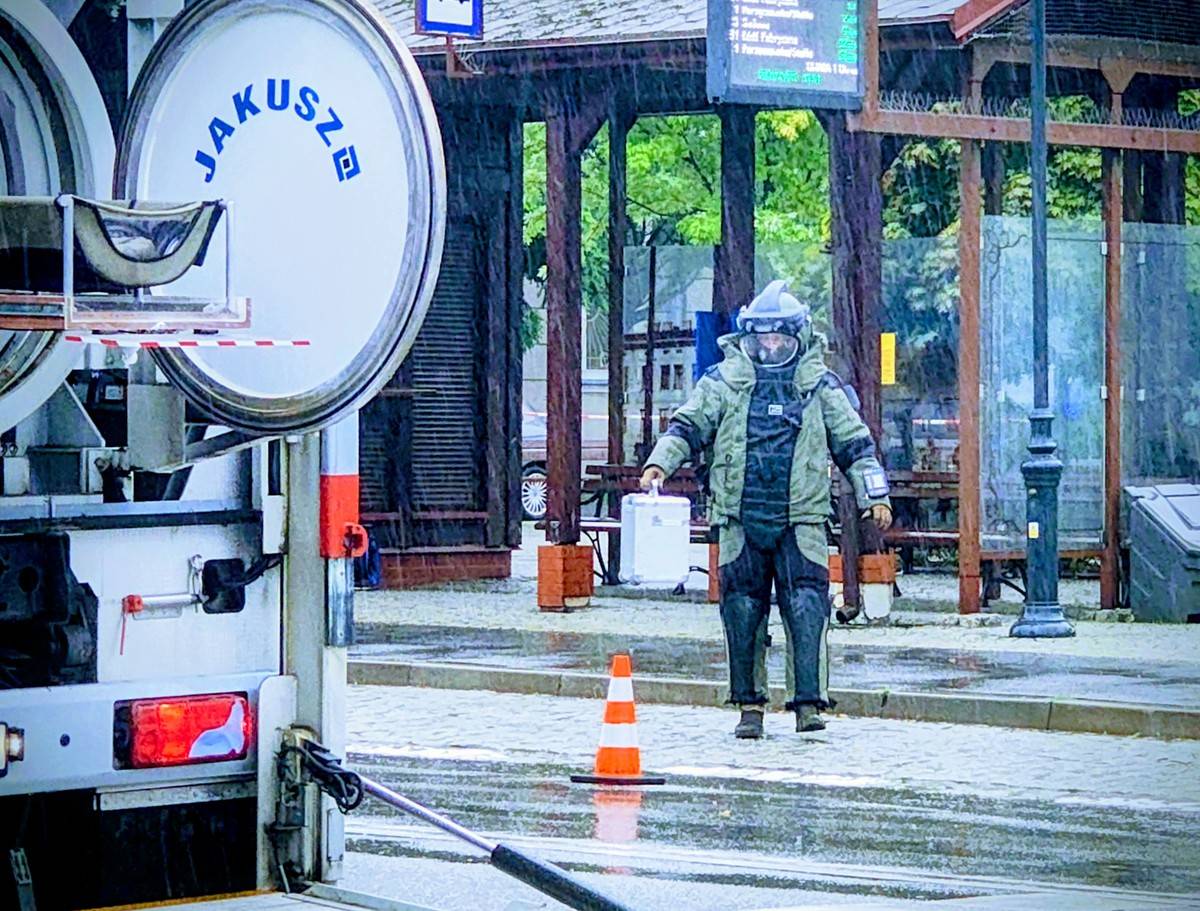 Do Zgierza przybyła specjalistyczna grupa minersko-pirotechniczna Samodzielnego Pododdziału Kontrterrorystycznego Policji z Łodzi. Po prześwietleniu zawartości podejrzanej walizki, funkcjonariusz w specjalnym kombinezonie EOD ostrożnie przetransportował bagaż do pojazdu technicznego.
