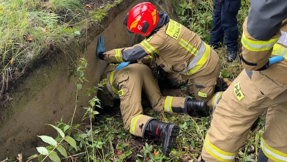 72-latek utknął w przepuście pod drogą. Seniora wyciągali strażacy, a on sam „nie wie, jak się tam znalazł” [Foto]