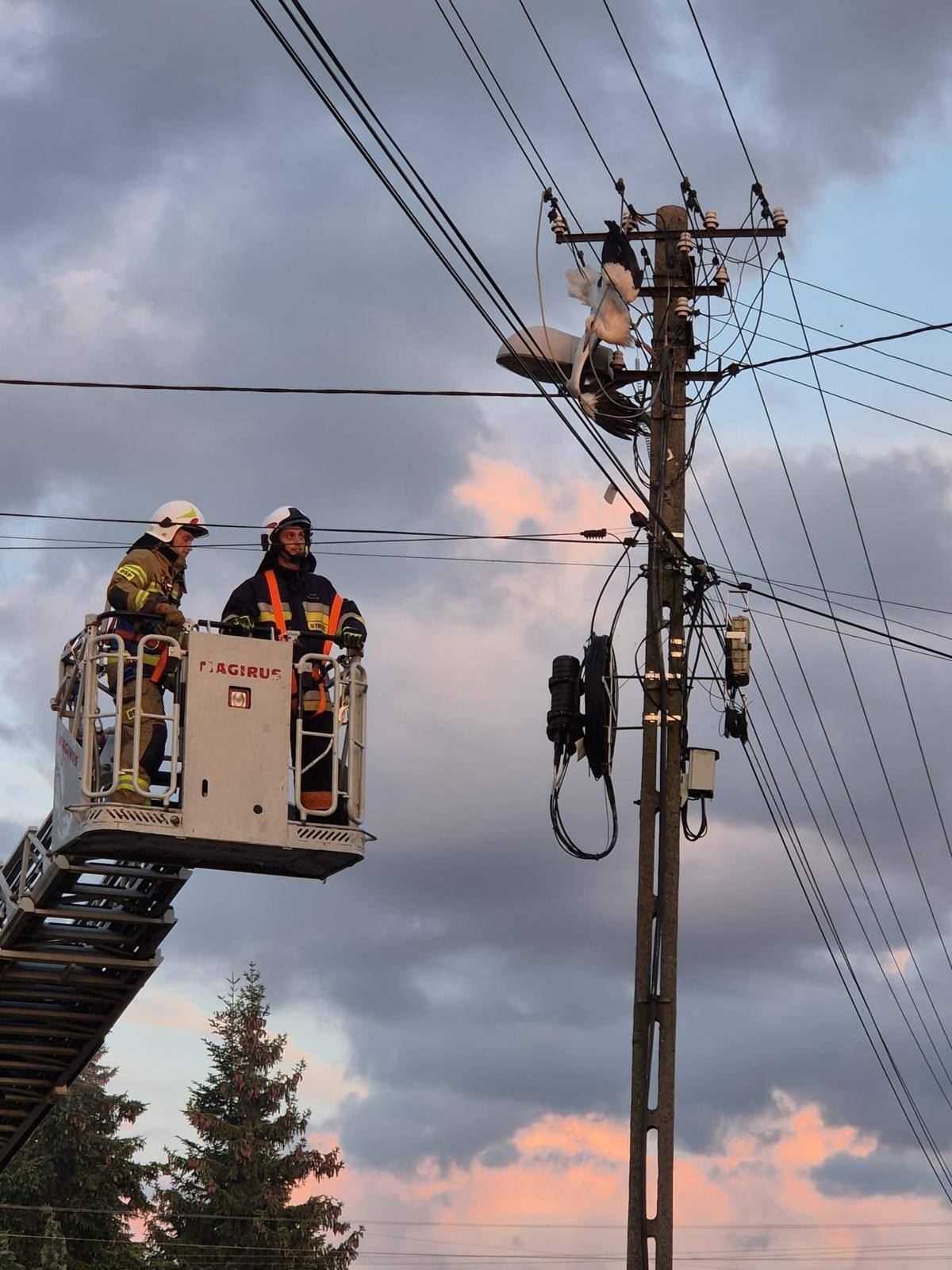 Akcja ratunkowa na wysokościach i "pod napięciem". Bocian zaplątał się w linie energetyczne. Na ratunek ruszyli strażacy