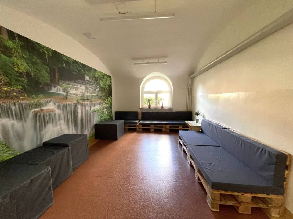 Jak wygląda nowa oaza spokoju? Pomieszczenie jest przytulne i funkcjonalne. Ustawiono w nim wygodne kanapy i pufy, na ścianach pojawiła się tapeta z widokiem na las, a wnętrze uzupełniają rośliny.