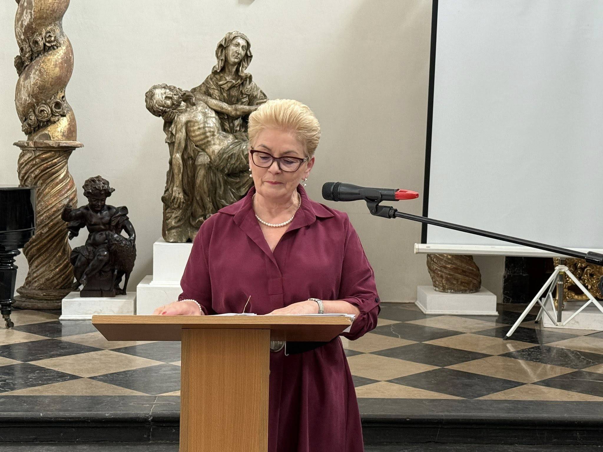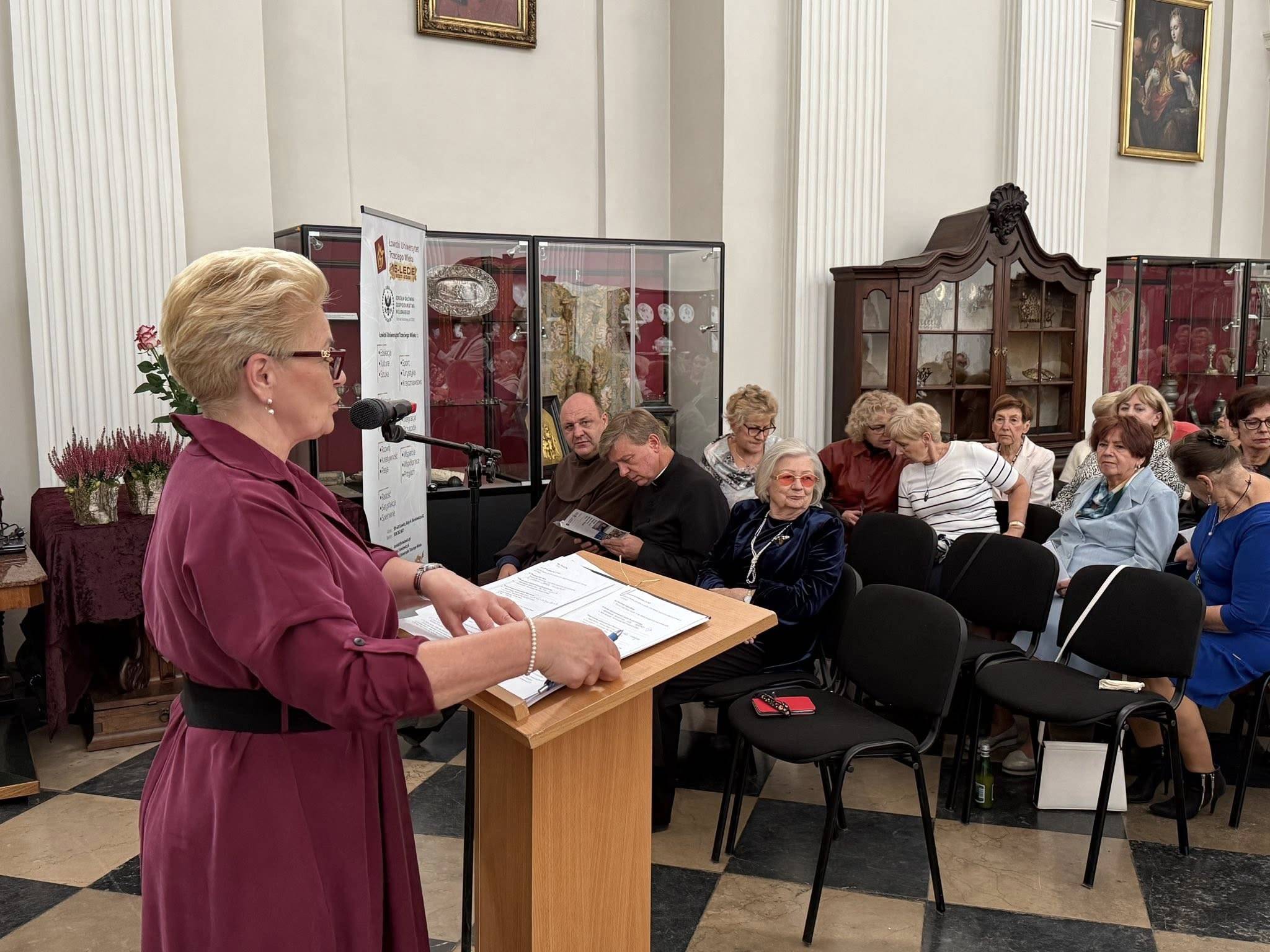Następnie głos zabrała prezes ŁUTW, pani Krystyna Kucharska, która serdecznie przywitała wszystkich uczestników i przypomniała historię powstania Łowickiego Uniwersytetu Trzeciego Wieku. W swoim przemówieniu nawiązała także do idei uniwersytetów trzeciego wieku na świecie – inicjatyw, które dają seniorom szansę na rozwój osobisty, aktywność społeczną i realizację pasji.
