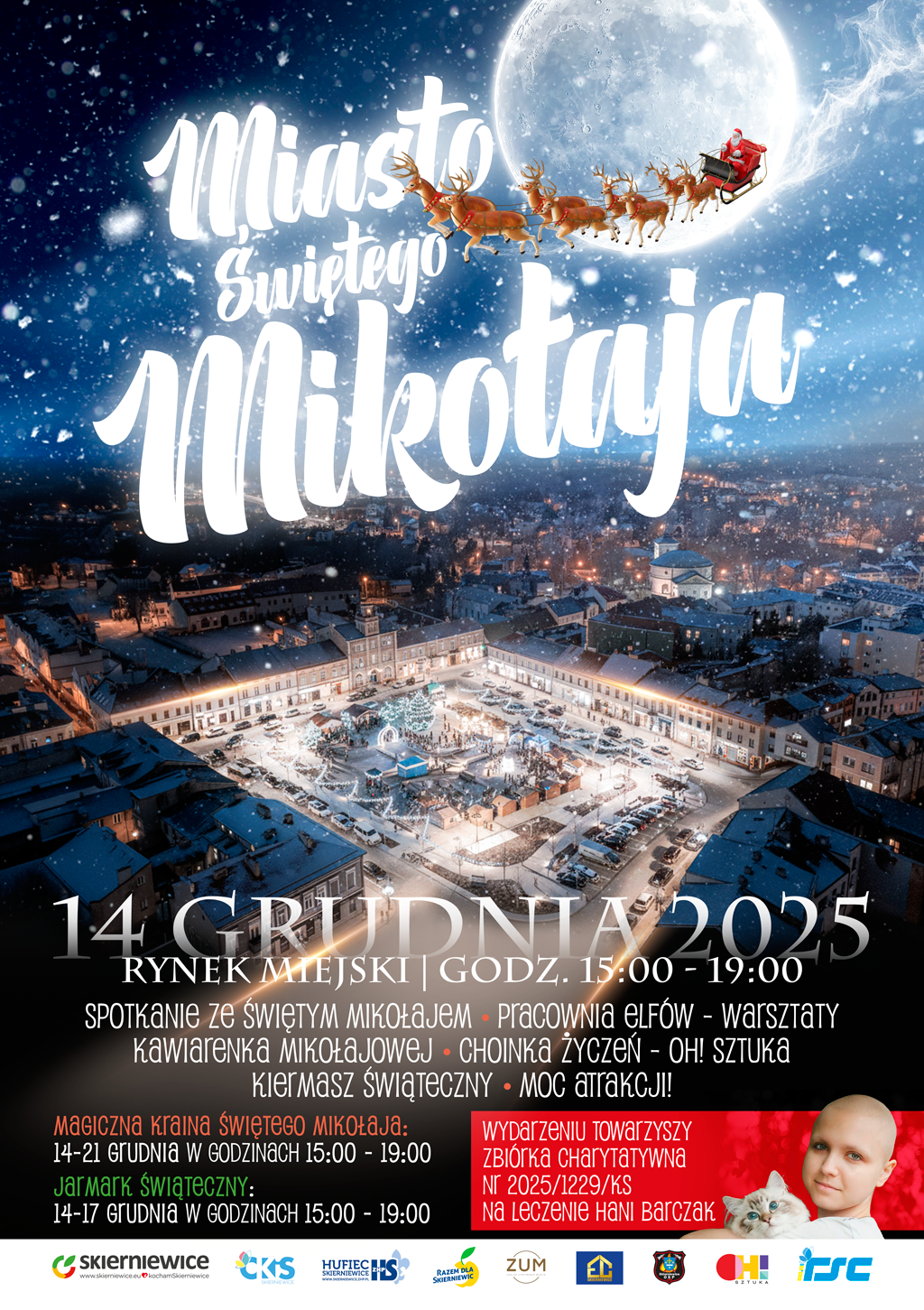 14 grudnia rynek tętnić będzie życiem podczas imprezy „Miasto Świętego Mikołaja". To dzień pełen spotkań, warsztatów, animacji i wspólnego świętowania. Pojawi się „Choinka Życzeń", pracownia elfów, kawiarenka, kiermasz i Betlejemskie Światło Pokoju, które o godz. 18:00 przekażą harcerze. Całość dopełni przejażdżka bryczką Arkadiusza Jażdżyka — jak z zimowych pocztówek.