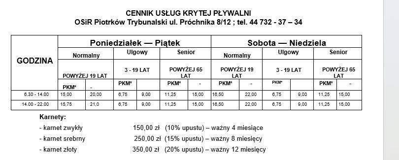 Cennik usług krytej pływalni przy ul. Próchnika dostępny jest w galerii zdjęć.