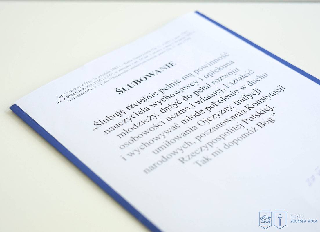 Ślubowanie nauczycieli mianowanych w Zduńskiej Woli: "Ślubuję rzetelnie pełnić mą powinność nauczyciela wychowawcy i opiekuna młodzieży, dążyć do pełni rozwoju osobowości ucznia i własnej, kształcić i wychowywać młode pokolenie w duchu umiłowania Ojczyzny, tradycji narodowych, poszanowania Konstytucji Rzeczypospolitej Polskiej". Ślubujący może dodać formułę „Tak mi dopomóż Bóg."