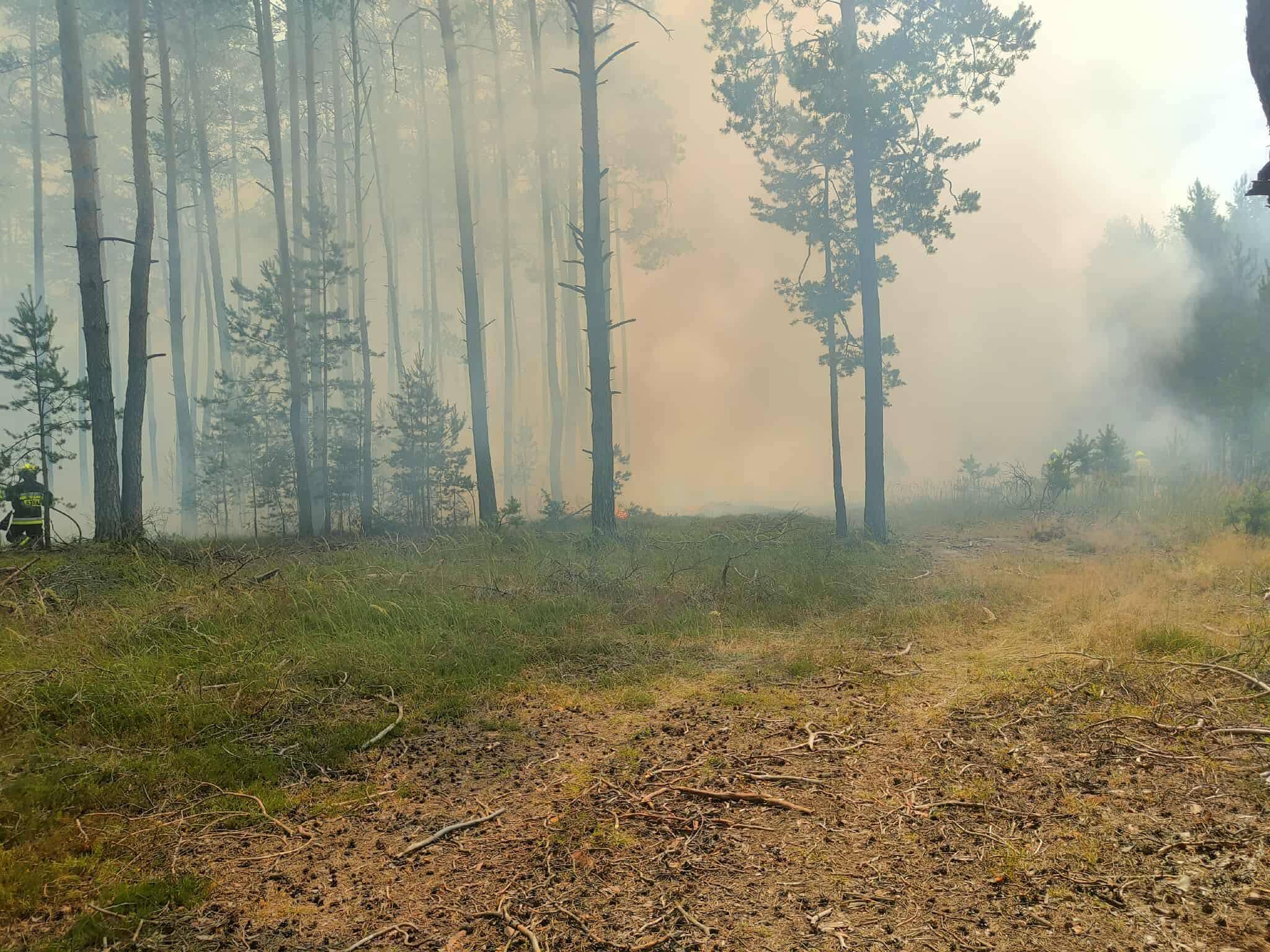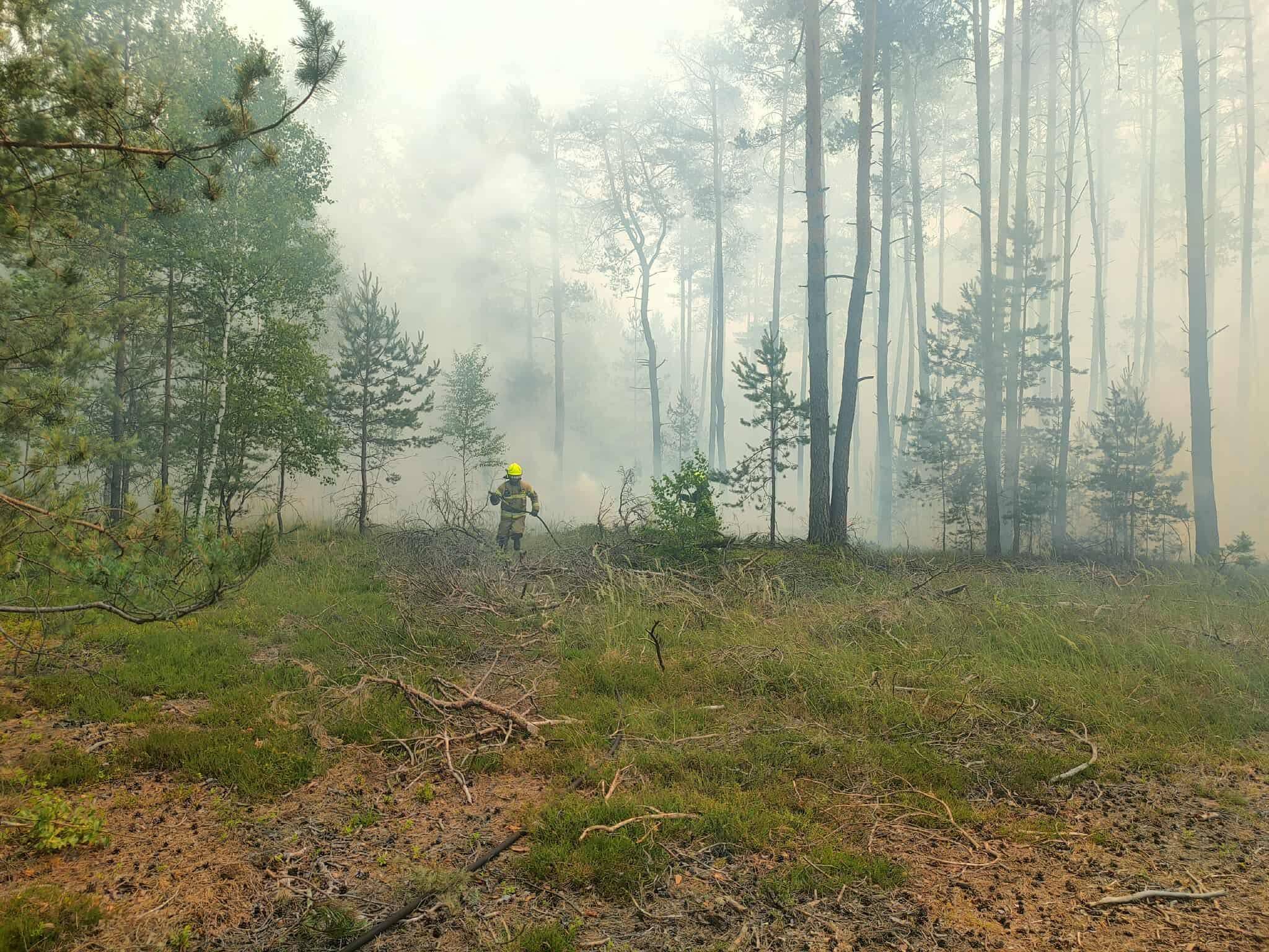 Na miejscu pracowało łącznie 10 zastępów straży pożarnej, w tym jednostki OSP z Kaszewic, Kluk (dwa zastępy), Kamienia, Grocholic, Łękawy oraz Bełchatowa. Do działań włączyła się również Jednostka Ratowniczo-Gaśnicza z Bełchatowa, dysponująca dwoma pojazdami. W trudnych warunkach, przy dużym zadymieniu i wysokich temperaturach, pomoc z powietrza zapewnił samolot gaśniczy udostępniony przez Nadleśnictwo.