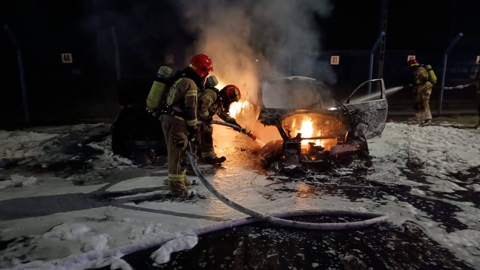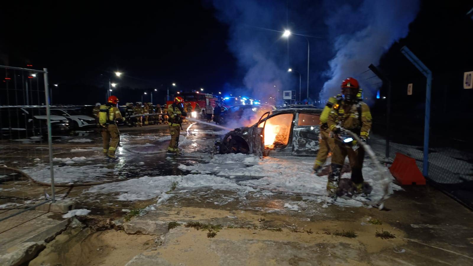 Po dotarciu pierwszych zastępów na miejsce zdarzenia potwierdzono rozwinięty pożar dwóch pojazdów - samochodu spalinowego marki Hyundai i20 oraz elektrycznego Hyundaia Ioniq. Ogień objął całkowicie obie maszyny.