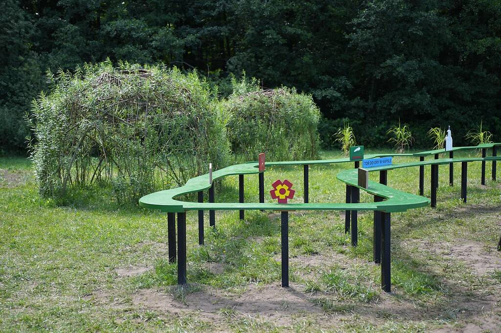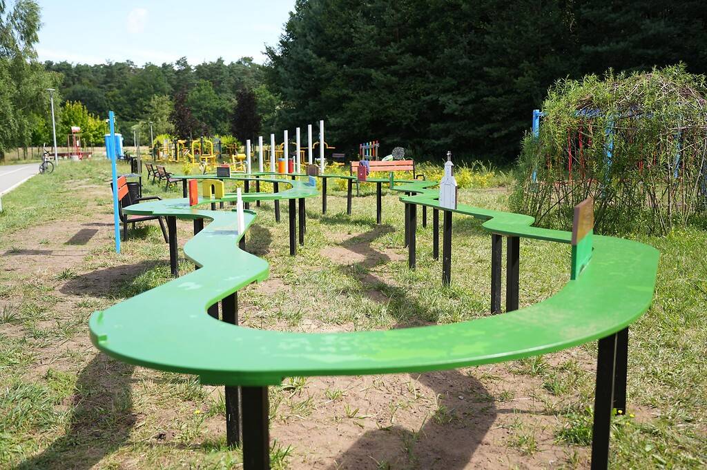 Nie zabrakło też miejsca do odpoczynku. Trzy przestrzenne szałasy zbudowane z wierzby wikliniarskiej tworzą naturalne altany dające cień i klimatyczny azyl, a wokół nich rozmieszczono ławki, stojak na rowery, kosz na śmieci oraz tablicę informacyjną z zasadami korzystania z obiektu. Całość dopełniają odporne na suszę nasadzenia miskantów, które nadają przestrzeni harmonijny i ekologiczny charakter.