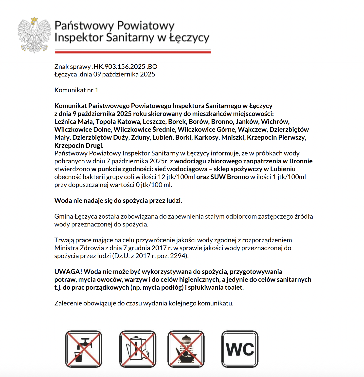 Do tego czasu nadal obowiązuje całkowity zakaz spożywania wody z wodociągu Bronno.