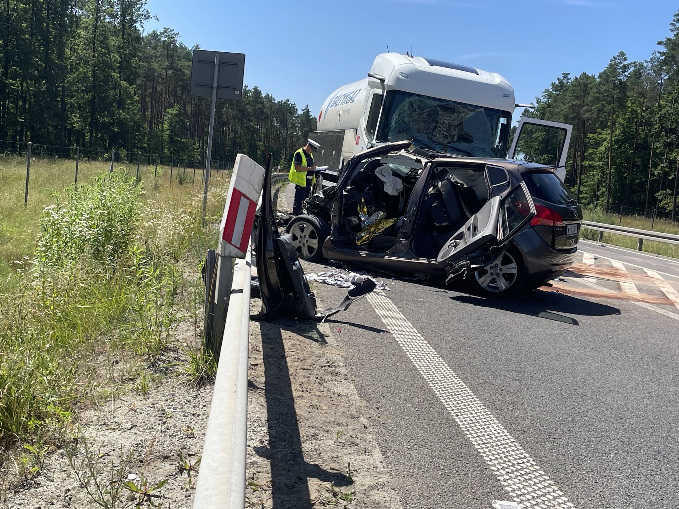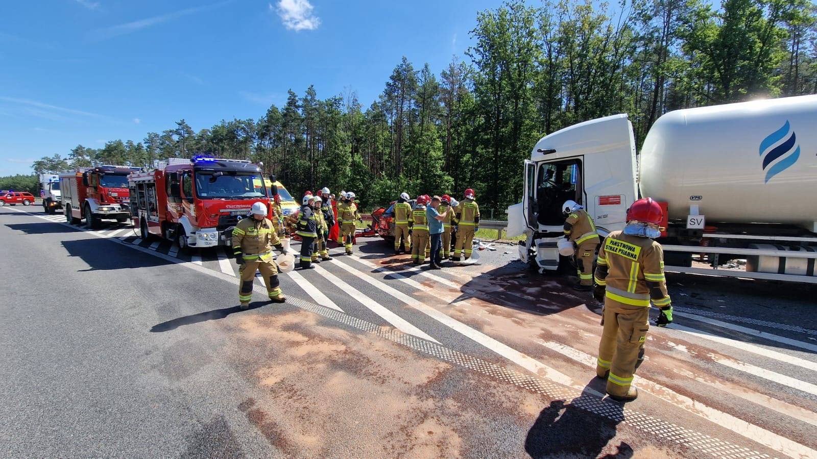 Do zdarzenia doszło w poniedziałek, 30 czerwca tuż przed godziną 10.00 rano. Wstępnie wszystko wskazuje na to, że kierujący samochodem osobowym Kia, zjechał na przeciwległy pas ruchu, wówczas doszło do czołowego zderzenia z ciągnikiem siodłowym przewożącym ładunek gazu.