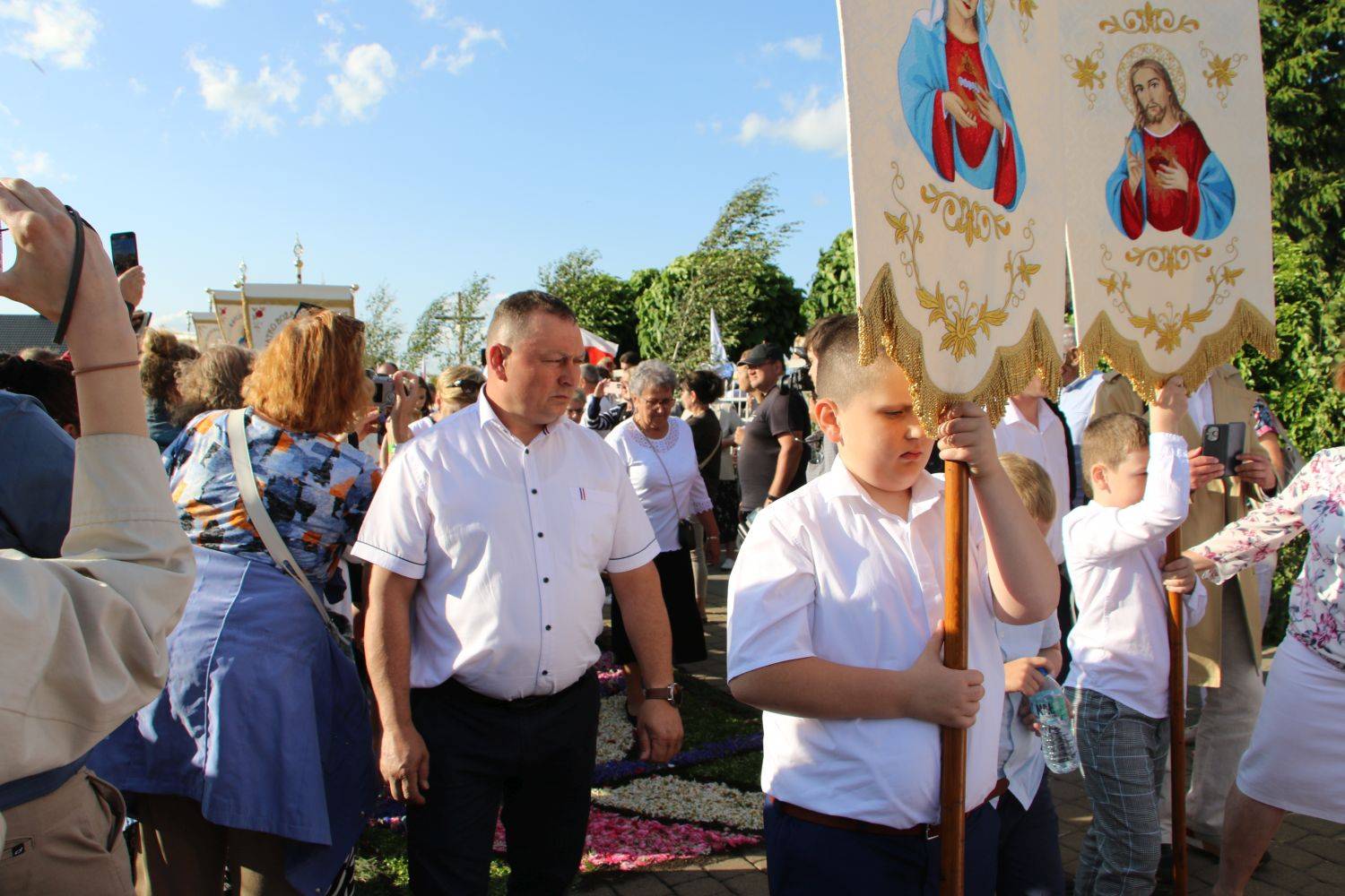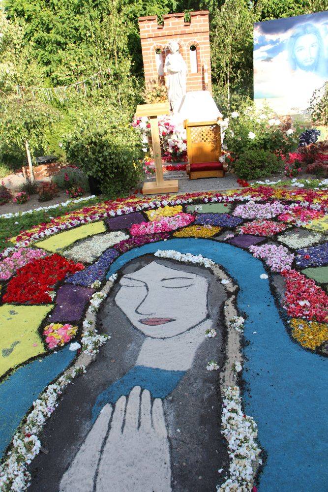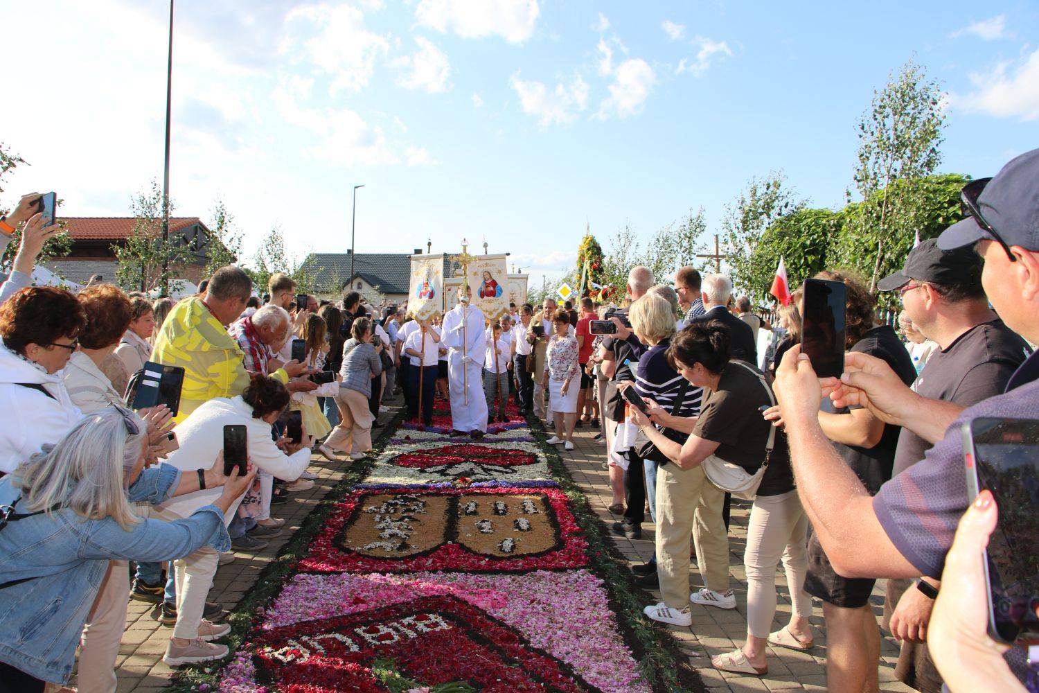 Ostatnie poprawki przed procesjąOkoło godziny 14.00 dywany były prawie gotowe. Mieszkańcy dopracowywali detale, poprawiali krawędzie i delikatnie zraszali kompozycje wodą. Kolorowe kobierce rozciągały się przez całą miejscowość, tworząc wyjątkową ścieżkę – swoistą modlitwę złożoną z kwiatów.