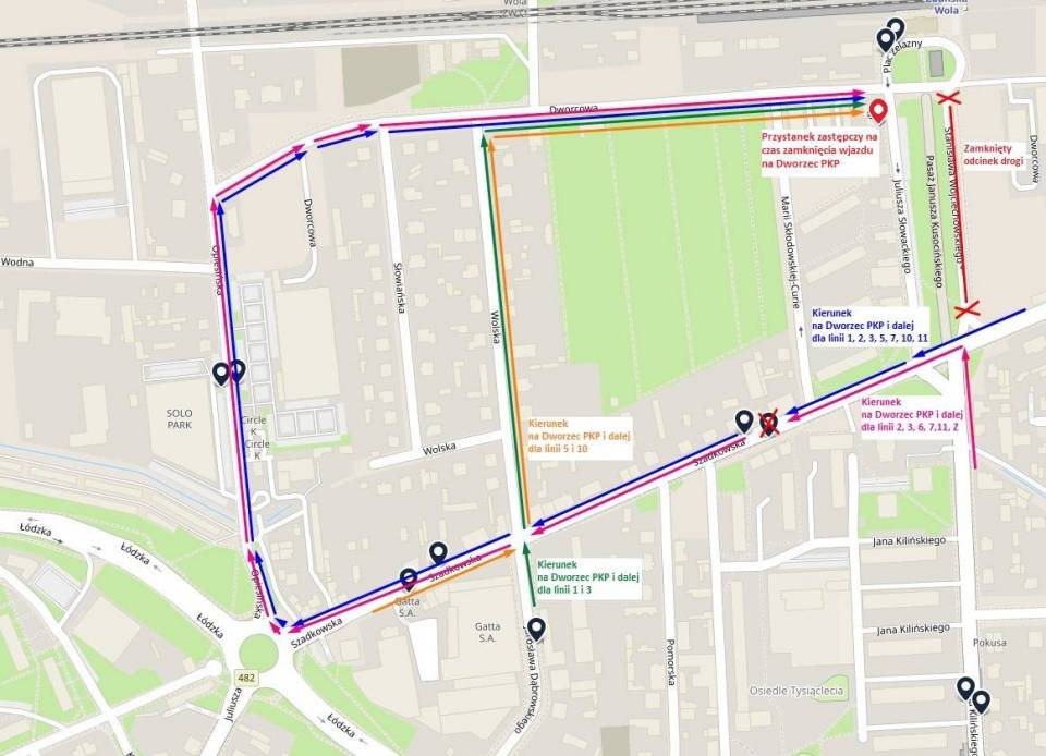 Autobusy linii nr 5 i 10 z Szadkowskiej będą skręcały w ul. Wolską do ul. Dworcowej na przystanek zastępczy, podobnie jak autobusy linii 1 i 3 z ulicy Jarosława Dąbrowskiego wjadą w ul. Wolską. W przeciwną stronę trasa pozostaje bez zmian.
