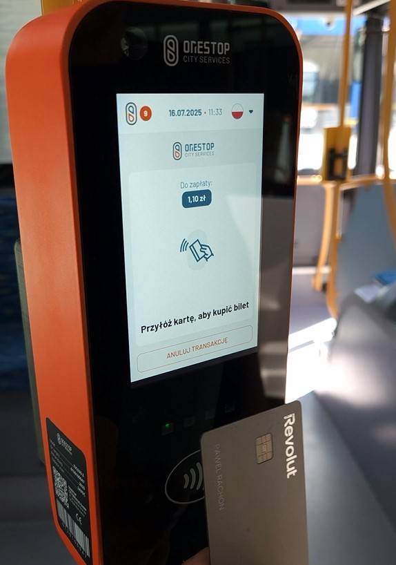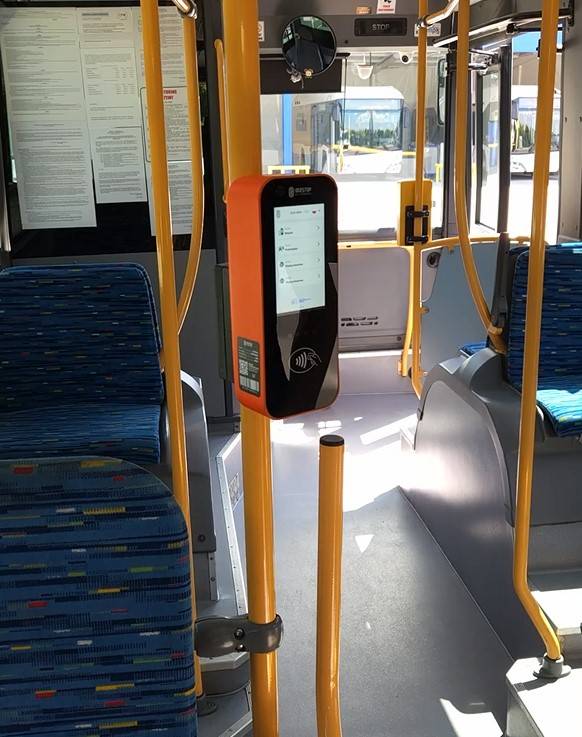 Po wejściu do autobusu terminala trzeba szukać w jego środkowej części. Na panelu wybrać trzeba strefę, rodzaj biletu (normalny lub z ulgą), a na koniec przyłożyć kartę zbliżeniową, by zapłacić za przejazd.