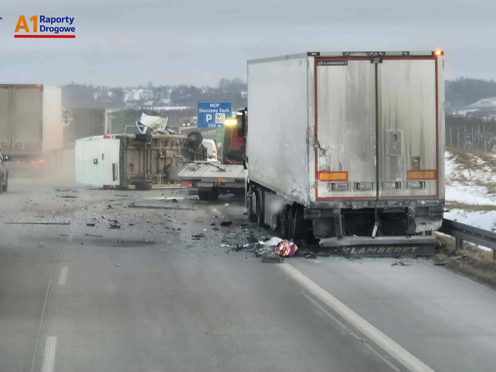 Wypadek spowodował całkowite zablokowanie dwóch pasów ruchu w kierunku Katowic. Na miejscu pracują służby. Informacje o sytuacji potwierdzają również komunikaty publikowane w mediach społecznościowych, m.in. na profilu poświęconym raportom drogowym z autostrady A1.